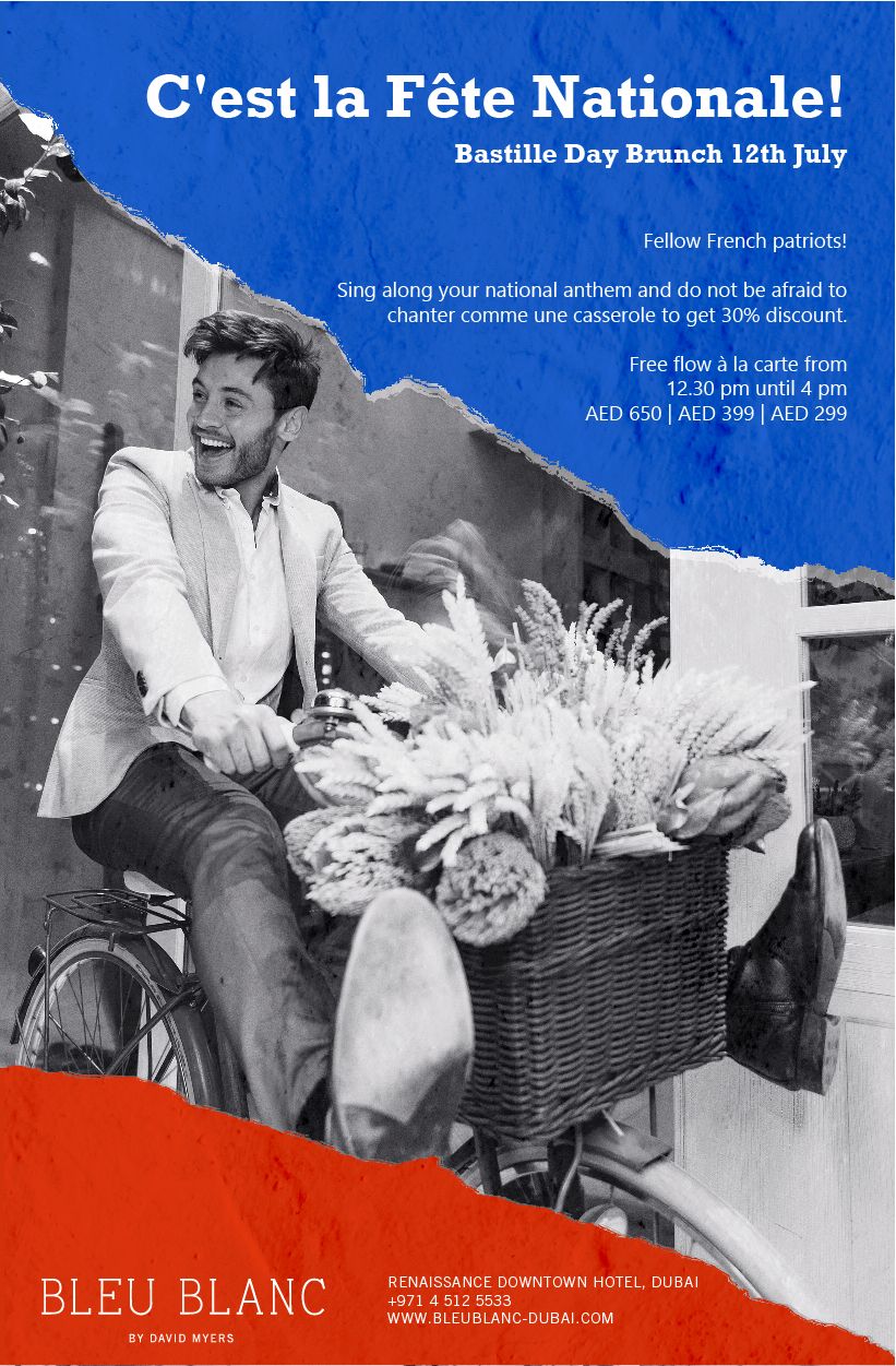 Le Vendredi 12 Juillet 2019, RenDXB organise un brunch dedie a la Fete Nationale Francaise a Bleu Blanc et si vous chantez même une phrase de l'hymne national de France, vous pourrez obtenir 30% de réduction sur l'addition!