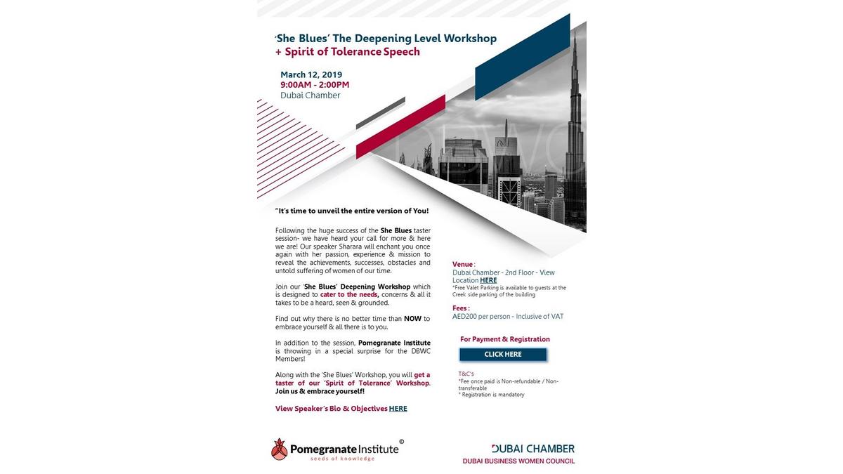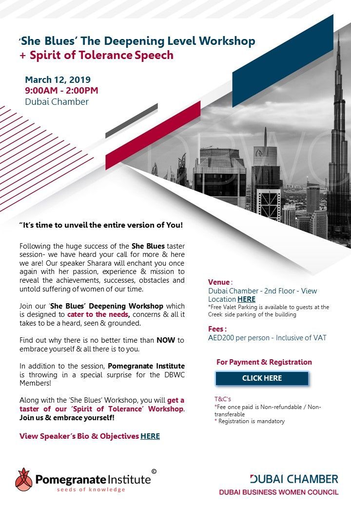 Workshop in collaboration with Pomegranate Institute entitled ‘She Blues The Deepening Level Workshop + Spirit of Tolerance Speech’ which will be held on Tuesday March 12, 2019.