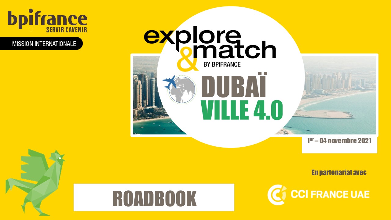 Du 1er au 4 Novembre 2021, en partenariat avec Bpifrance, nous accompagnons douze entreprises françaises du secteur de la mobilité et du développement durable au cœur de Expo 2020 Dubai à travers la mission internationale « Explore & Match : Dubaï, Ville 4.0 ».