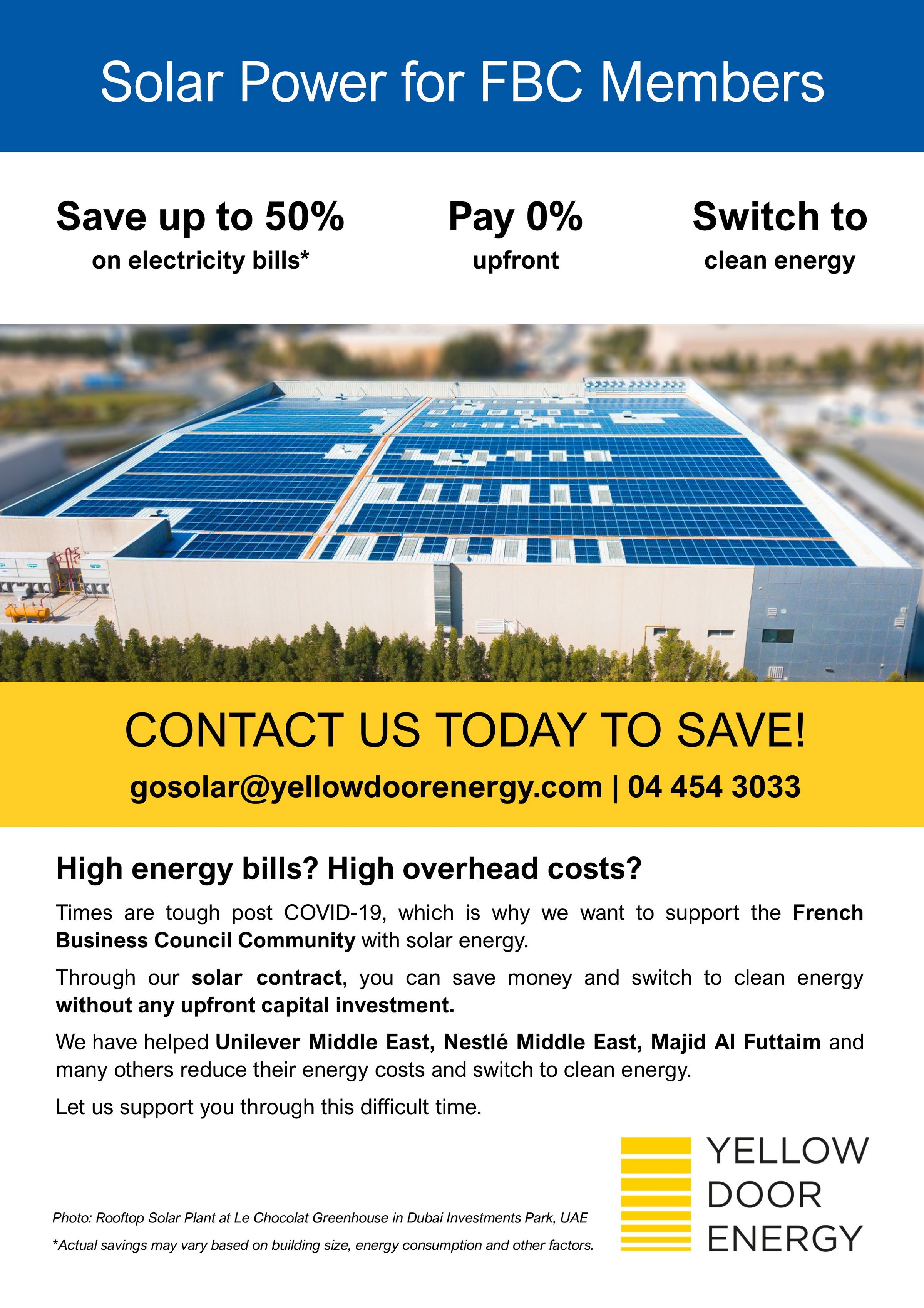 Une facture énergétique élevée ? Des frais généraux élevés ? Les temps sont durs après COVID-19, c'est pourquoi nous voulons soutenir la Communauté française du French Business Council avec l'énergie solaire.