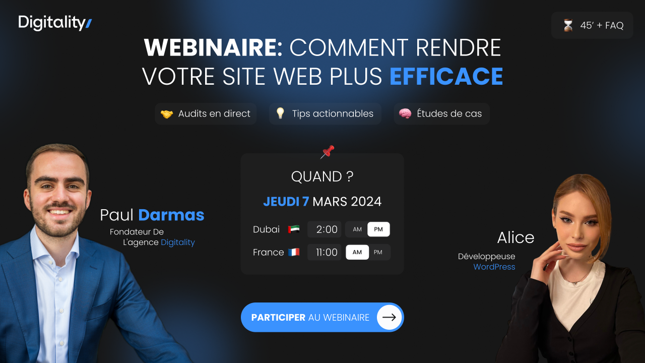 Une initiative née de l'enthousiasme et des feedbacks positifs reçus lors de nos ateliers en présentiel. ? Audits en Direct : Votre site sera peut-être choisi pour une analyse en temps réel, offrant des insights précieux pour tous. ? Tips Actionnables : Repartez avec des conseils pratiques que vous pourrez appliquer immédiatement pour booster la performance de votre site. ? Études de Cas : Apprenez des réussites (et des erreurs!) des autres grâce à des analyses de cas concrets. Que vous soyez un professionnel aguerri du web ou simplement curieux de savoir comment améliorer votre présence en ligne, ce webinaire est fait pour vous.