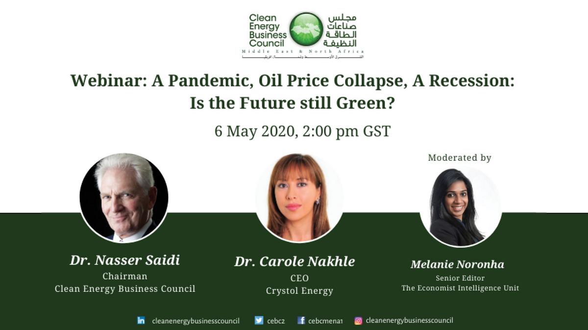 You are invited to the upcoming CEBC webinar on "A Pandemic, Oil Price Collapse, A Recession: Is the Future still Green?" taking place on 6th of May at 2:00 pm GST.