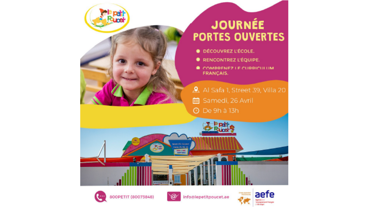 Le Petit Poucet, seule crèche et école maternelle française indépendante homologuée AEFE au Moyen-Orient, ouvre ses portes aux familles le samedi 26 avril de 9h à 13h.
