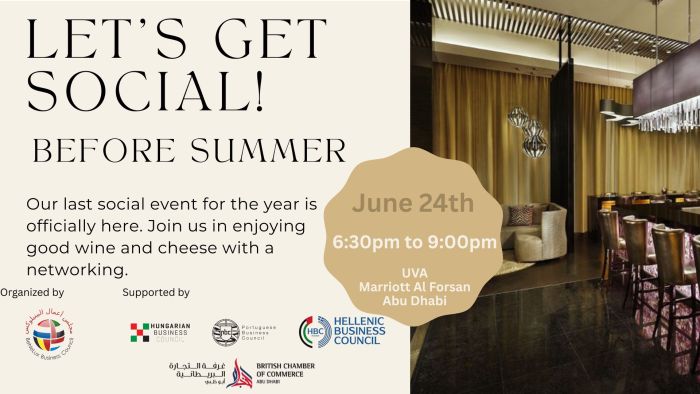 The BeNeLux Business Council, Hungarian Business Council, Hellenic Business Council and British Business Council are pleased to invite you to Let’s Social! before Summer, taking place on Tuesday, June 24th, 2025 at UVA, Marriott Al Forsan.