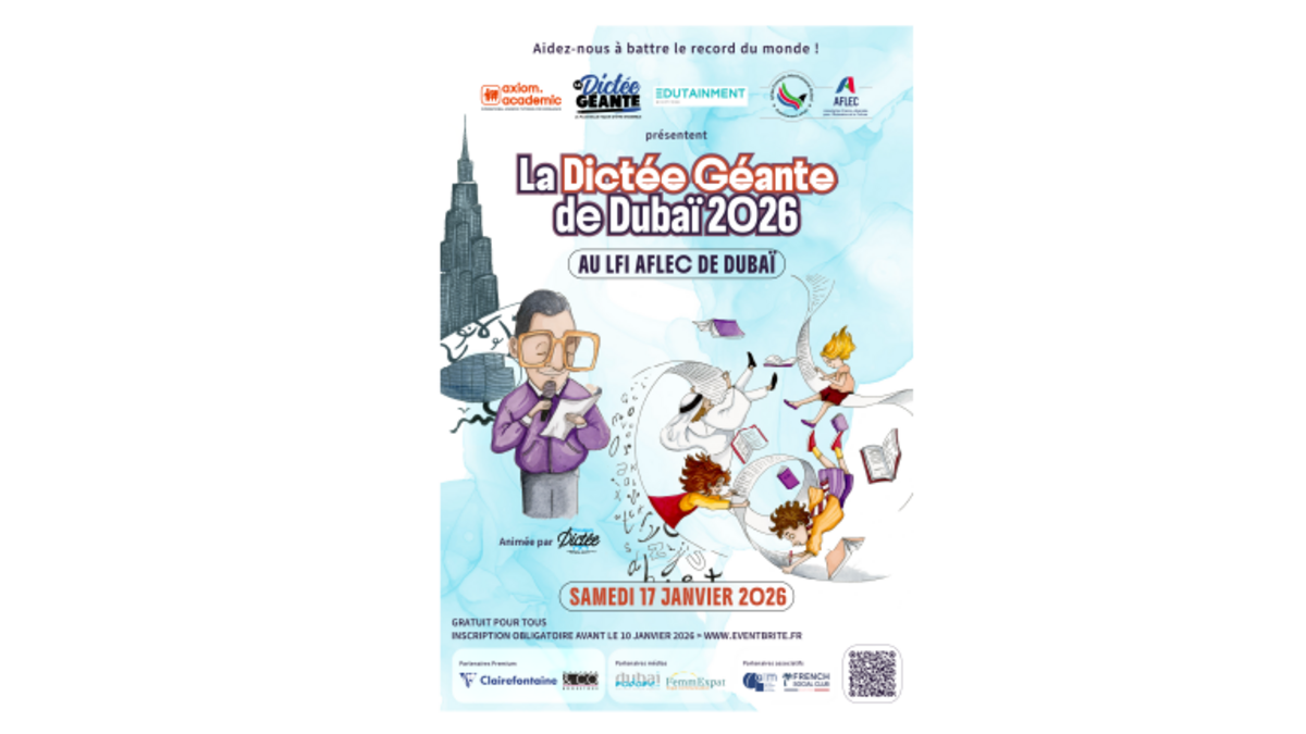 Organisée par Axiom Academic et Edutainment Solutions, en collaboration avec Rachid Santaki, alias « Monsieur Dictée® » et fondateur de La Dictée Géante®, et accueillie par le Lycée Français International AFLEC de Dubaï, cette journée conviviale réunira plus de 2 000 participants autour d’un moment fédérateur, culturel et ludique.