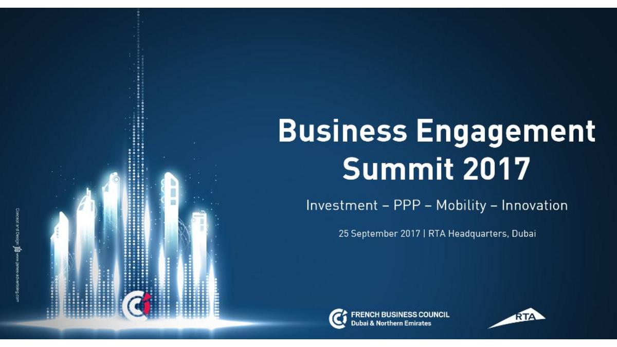 La RTA (Roads and Transport Authority) Dubaï et le French Business Council (FBC) ont organisé en septembre 2017 le premier Forum Franco-Emirati pour l'Investissement, des Partenariats Public-Privé, la Mobilité et l'Innovation.