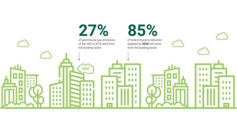 Based on the third and most recent Nationally Determined Contribution of the UAE submitted to the UNFCCC, the building sector represented 27 per cent of overall greenhouse gas emissions in the UAE in 2019. It will however deliver 85 per cent of the total emissions reduction targeted by the UAE for 2030.