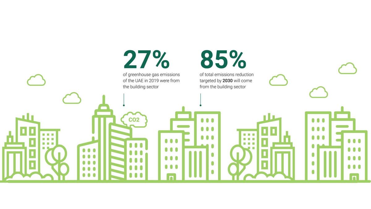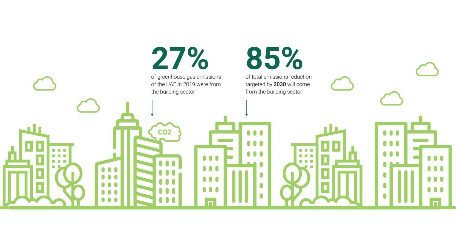 Based on the third and most recent Nationally Determined Contribution of the UAE submitted to the UNFCCC, the building sector represented 27 per cent of overall greenhouse gas emissions in the UAE in 2019. It will however deliver 85 per cent of the total emissions reduction targeted by the UAE for 2030.