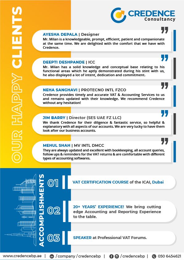 Credence Consultancy is a professional Tax, Accounting and Compliance firm located in Dubai. We deliver professional and cutting-edge advice and services in the areas of VAT, Compliance (ESR, UBO, AML etc) and Outsourced Accounting. We have been speakers on VAT at a number of professional forums. Our satisfied clients are a testament to the quality of work that we deliver.