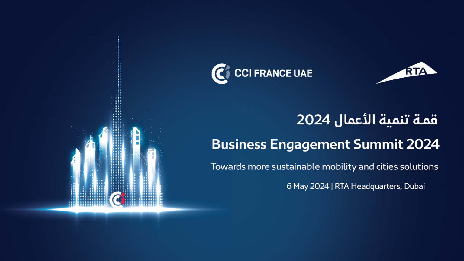 After fourth successful editions, the Roads and Transport Authority and CCI France UAE have the pleasure to organize the fifth edition of the Emirati-French Business Engagement Summit on Towards more sustainable mobility and cities solutions, on Monday 6th May 2024 at RTA Headquarters, Dubai.