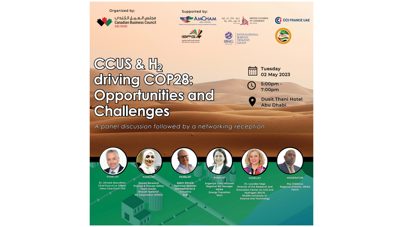 Le Conseil des affaires canadien d'Abu Dhabi - Communauté d'intérêt - Énergie est heureux d'organiser une discussion de panel sur les CCU et H2 conduisant à la COP28: Opportunités et défis.