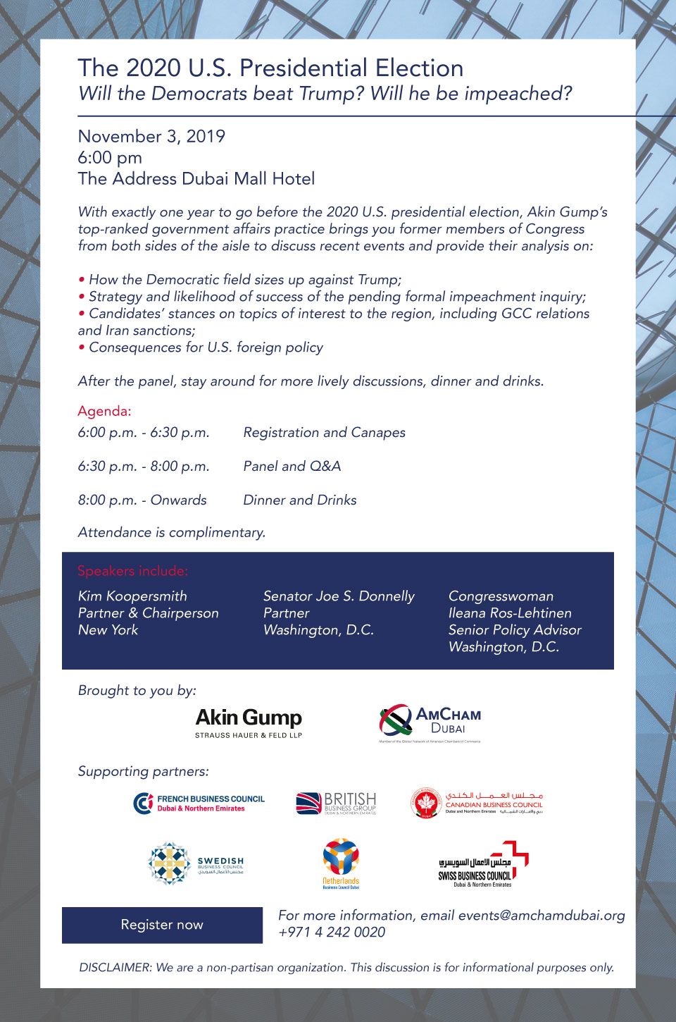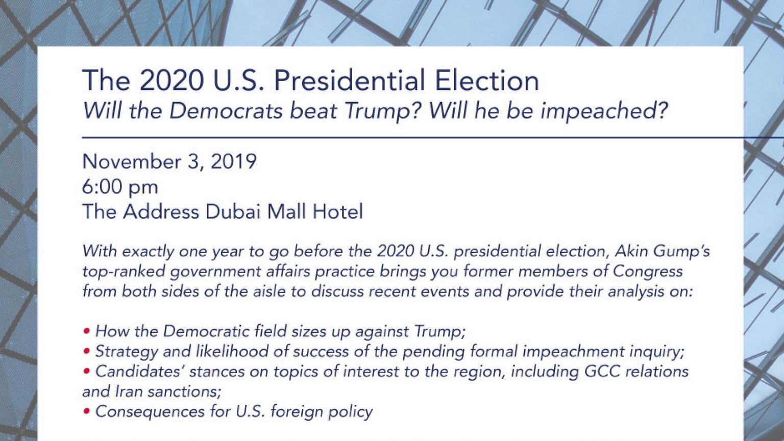 With exactly one year to go before the 2020 U.S. presidential election, Akin Gump's top-ranked government affairs practice brings you former members of Congress from both sides of the aisle to discuss recent events and provide their analysis on: