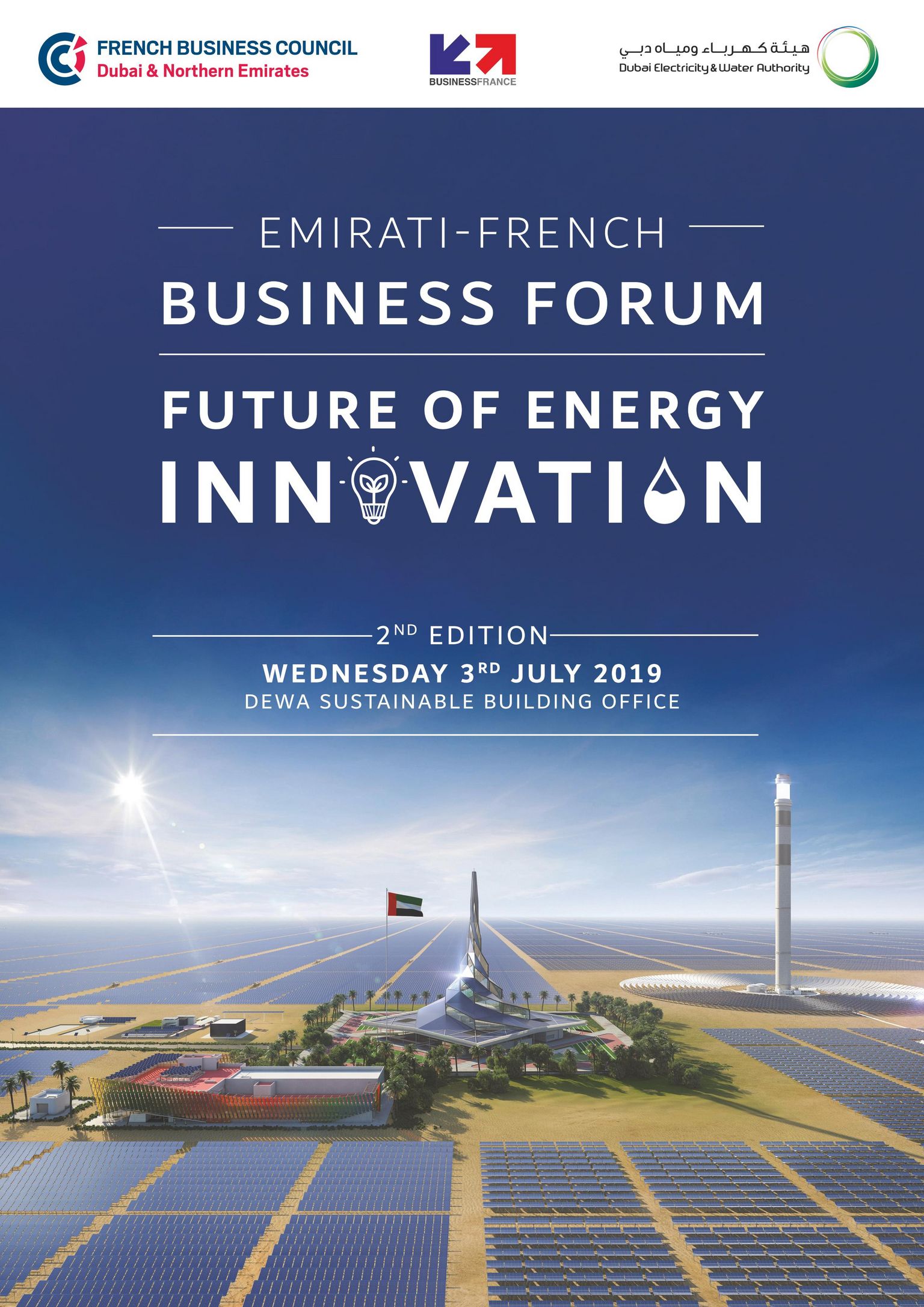 Après le succès de la 1ère édition en 2015, DEWA et les parties prenantes françaises sont convenues d’organiser un 2ème Forum des Entreprises en 2019 pour poursuivre le dialogue France/Emirats sur l’Energie et le Développement Durable, l’un des 3 piliers d’Expo 2020. S.E. Saeed Al Tayer, Managing Director et CEO de DEWA, et Son Excellence Ludovic Pouille, Ambassadeur de France aux Émirats Arabes Unis, ont déjà confirmé leur présence à l’événement.