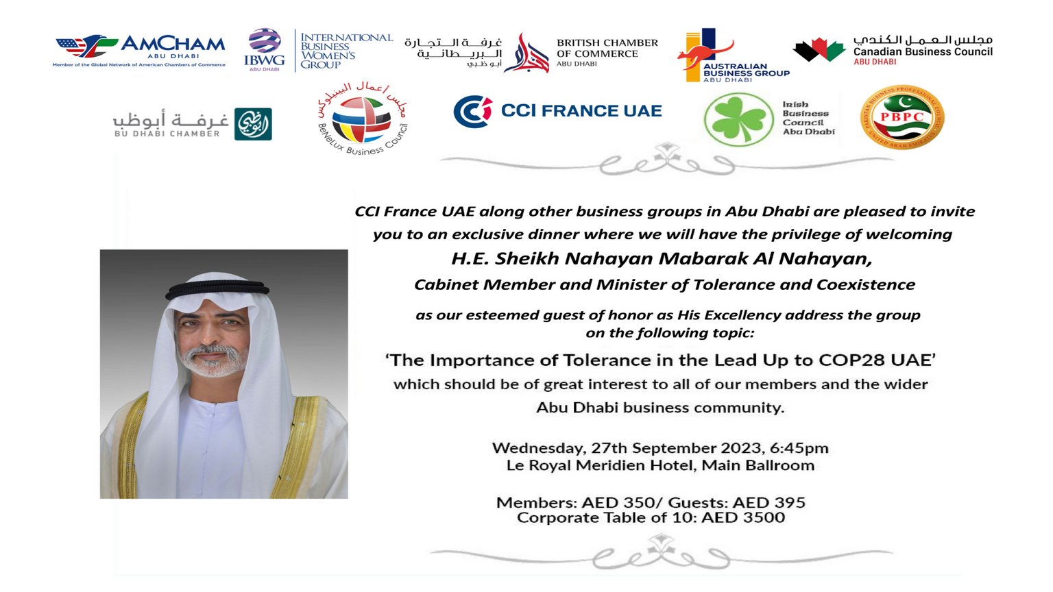 Rejoignez la CCI France UAE et d'autres groupes d'affaires pour une soirée spéciale avec S.E. Sheikh Nahayan Mabarak Al Nahayan, membre du cabinet et ministre de la tolérance et de la coexistence, qui s'adressera au groupe sur le thème : "L'importance de la tolérance dans la perspective de la COP28 aux Émirats arabes unis", qui devrait intéresser vivement tous nos membres et l'ensemble de la communauté d'affaires d'Abu Dhabi.