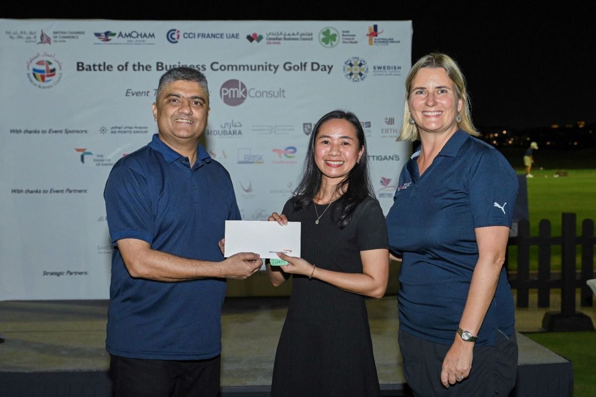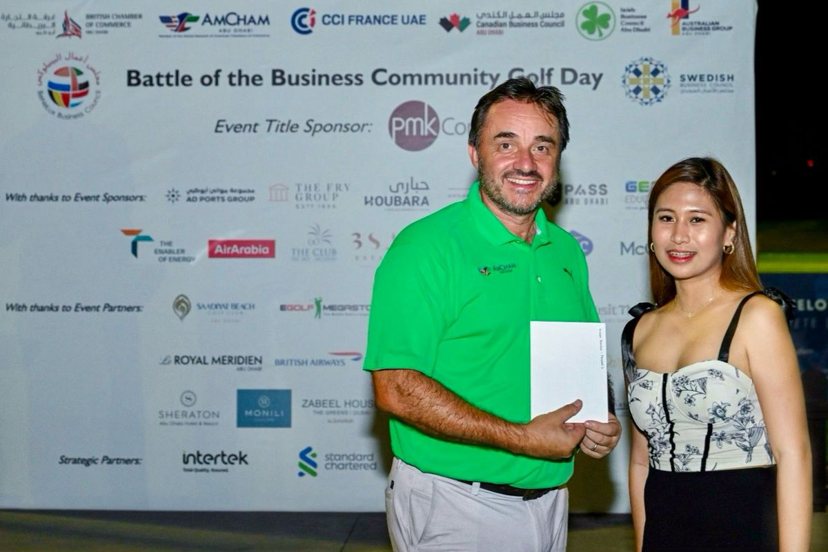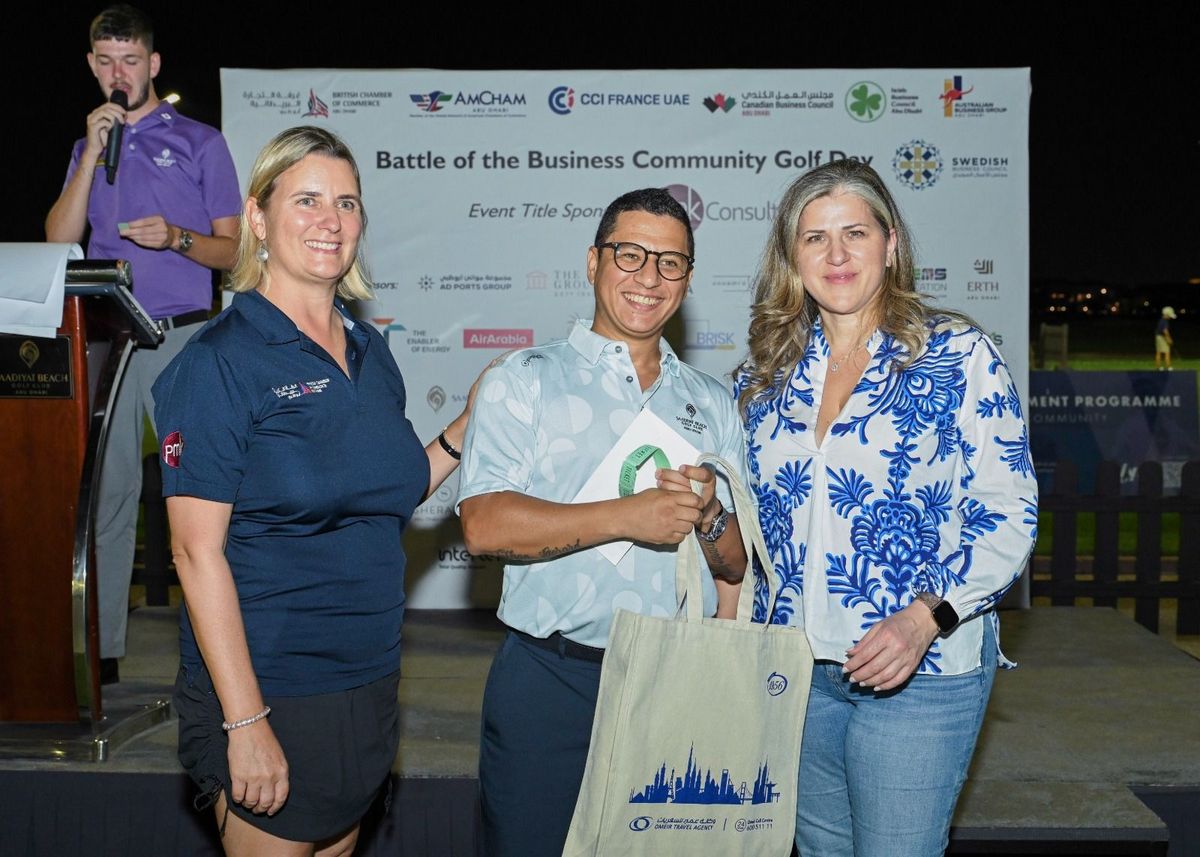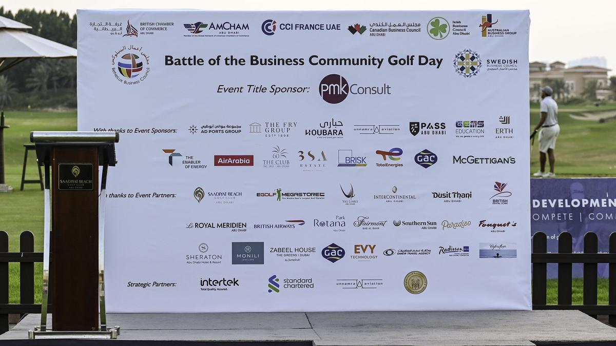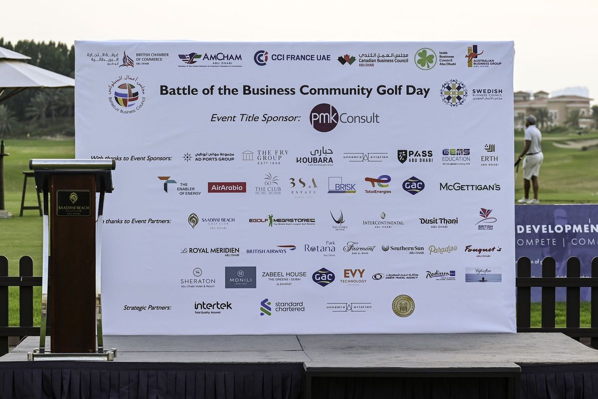 Players from CCI France UAE, British Chamber of Commerce Abu Dhabi, AmCham Abu Dhabi, Canadian Business Council, Irish Business Council, BeNeLux Business Council and Swedish Business Council for a fantastic corporate day out at our Battle of the Business Community Golf Day, in association with PMKConsult.
