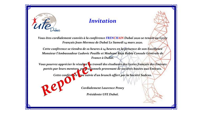 INVITATION – Conférence-Challenge de l’innovation FrenCHain 2020 Samedi 14 mars 2020, 10h-14h, Lycée français Jean Mermoz, Dubaï En présence de…